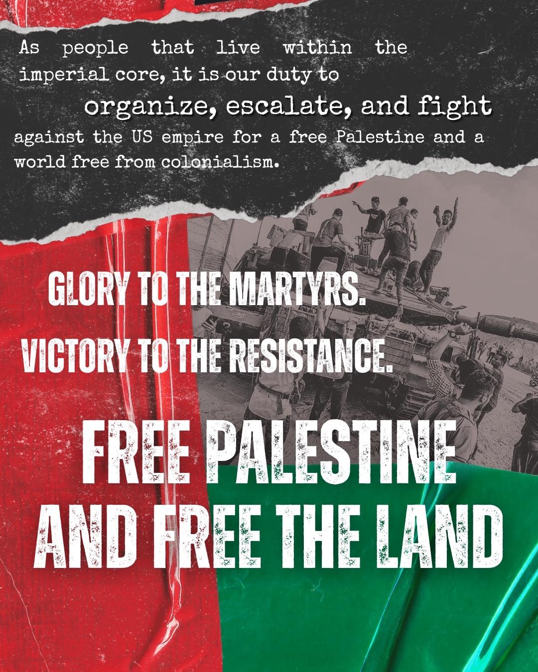 Red (Metro DC - Liberation Agitprop Committee): Since the 1910s, the majority of the blood that has soaked into the soil of Palestine has been that of Palestinians. It has been their bodies that have been used to fertilize the Venus fly trap that is the so-called State of Israel. October 7th, 2023 was a day when it was decided in spectacular fashion that IOF troops had no better usage for the world than as jarhead fertilizer. As the land continues to soak with blood, we stand with the resistance that will one day stand over the blooming flowers and olive trees which they've fought and given everything for. The struggle in Palestine is a spear tip for the struggle to realize a new and liberated world, and so all corners of the world look to it for guidance.